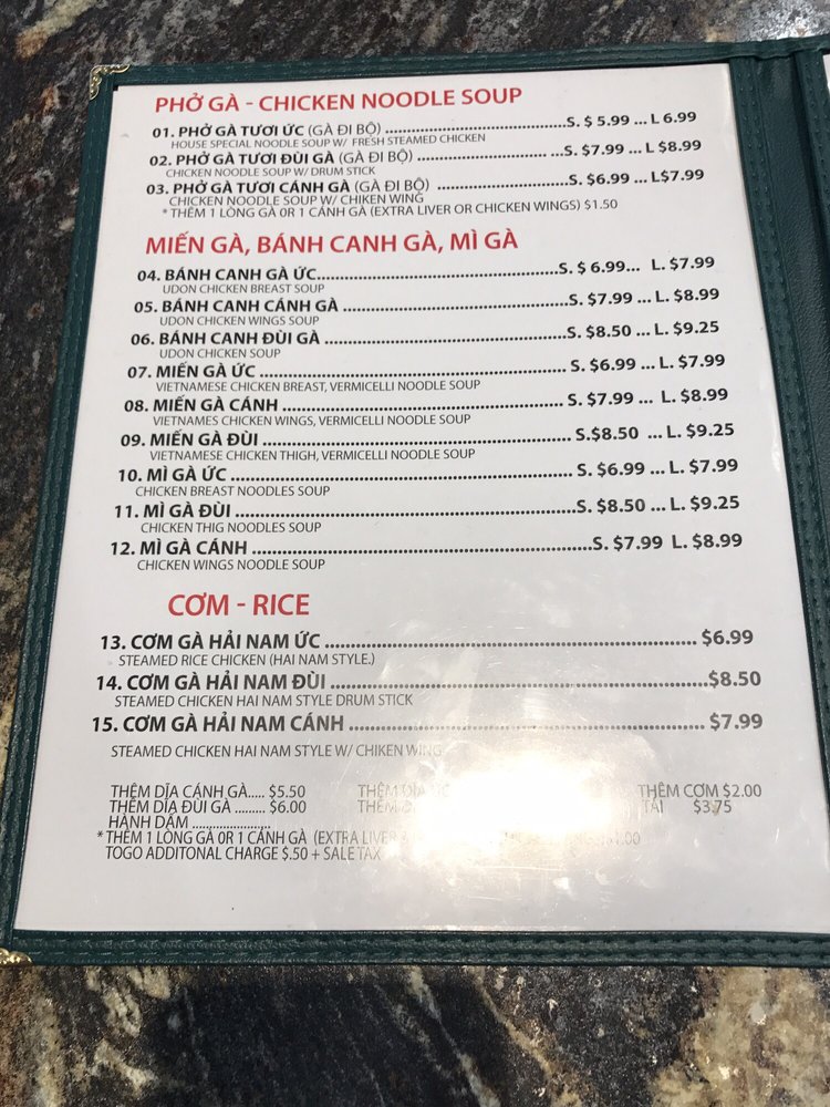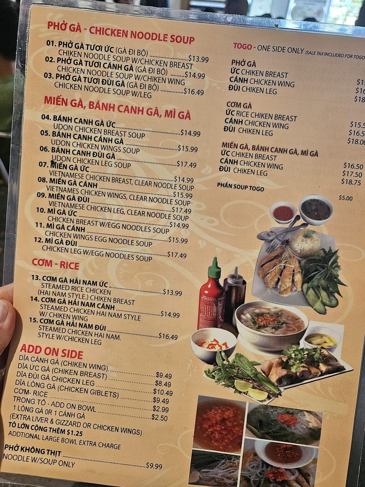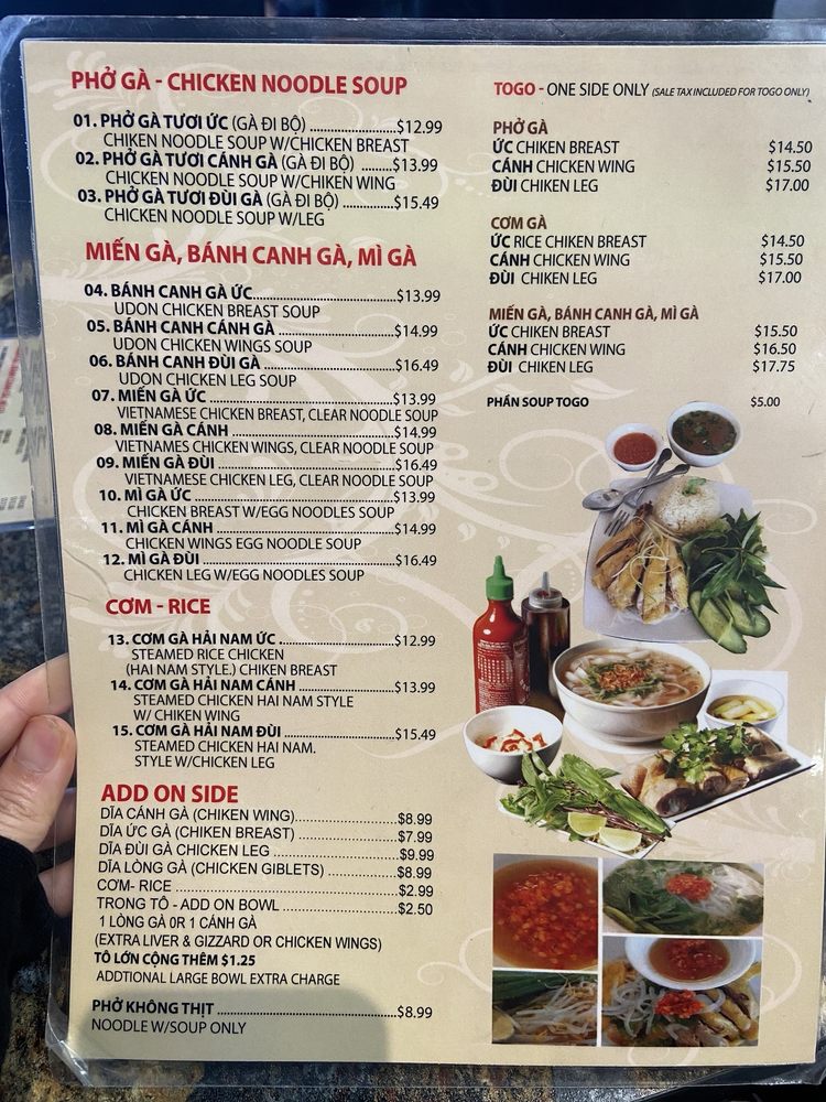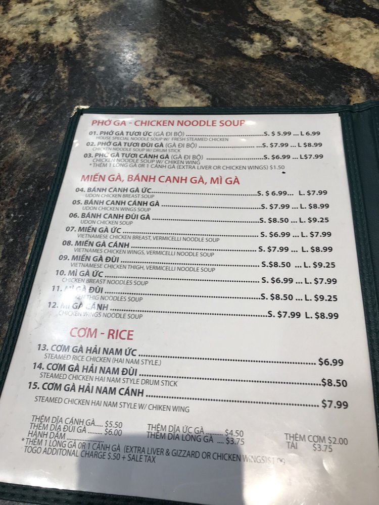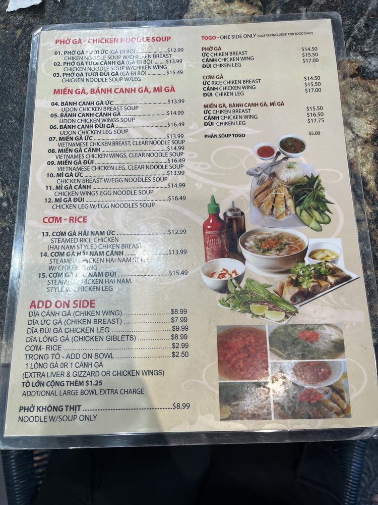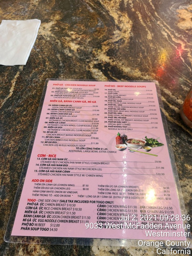 Welcome to Phở Sông Hải, a hidden gem in Westminster, CA, where authentic Vietnamese flavors take center stage. This cozy family-run establishment specializes in delicious noodles, particularly their famed Phở Gà and Bánh Canh Gà, which have garnered praise for their rich, aromatic broths and satisfying textures. The menu also features a variety of options, including vegetarian dishes and mouthwatering sides, such as Đĩa Uc Gà and Canh Chicken Wing.